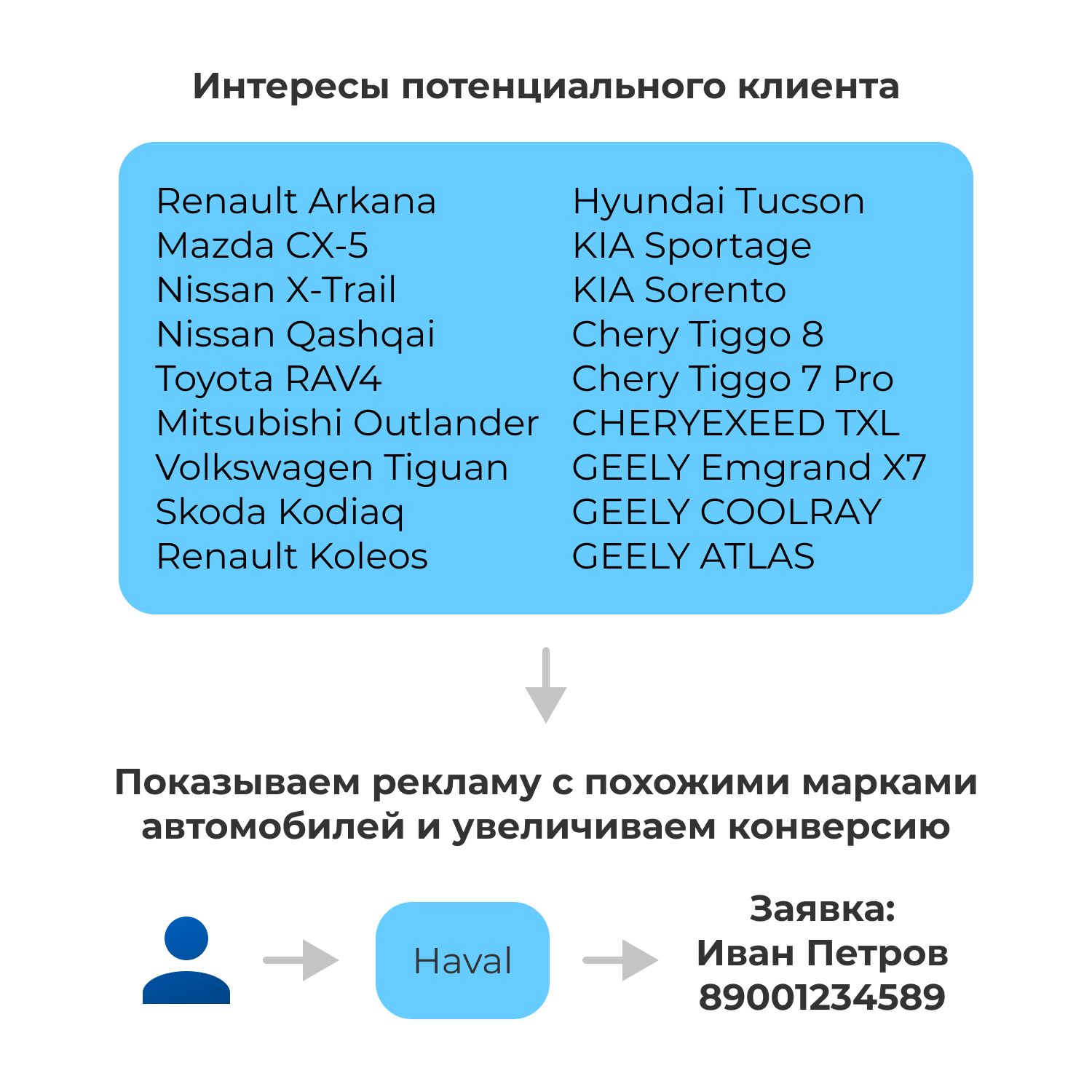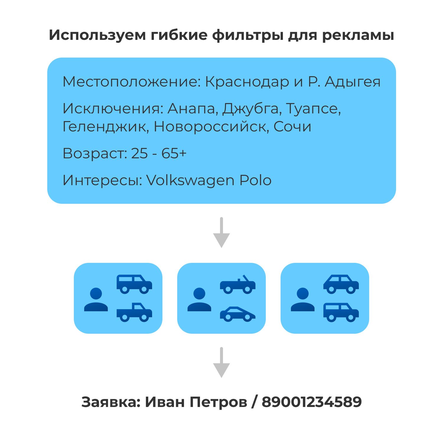 Берём базу контактов, которые у нас уже купили автомобиль или просто оставили контакт и загружаем эти базы в рекламные площадки.